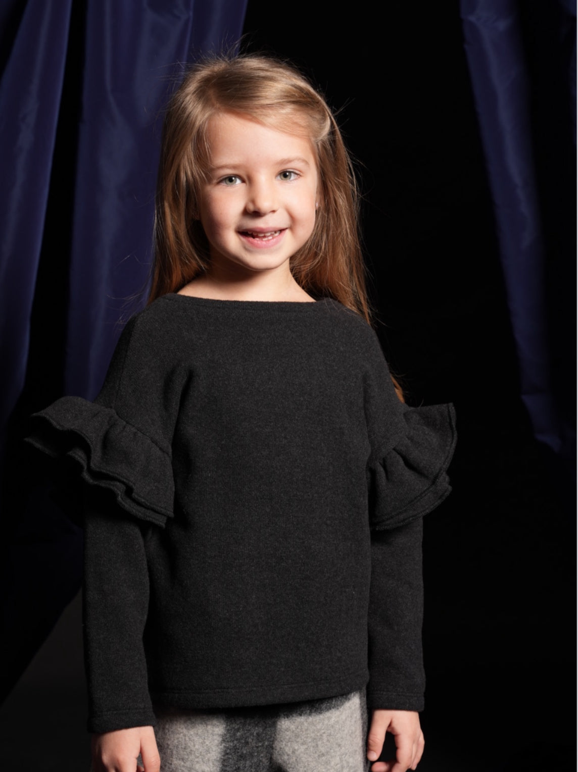 Questa felpa da bambina è perfetta per le giornate fredde grazie al suo morbido tessuto in caldo cotone. Il particolare dettaglio delle maniche con volant la rende unica e la sua vestibilità regolare la rende comoda da indossare. Abbinala al pantalone carbone in caldo cotone per un look completo e coordinato.