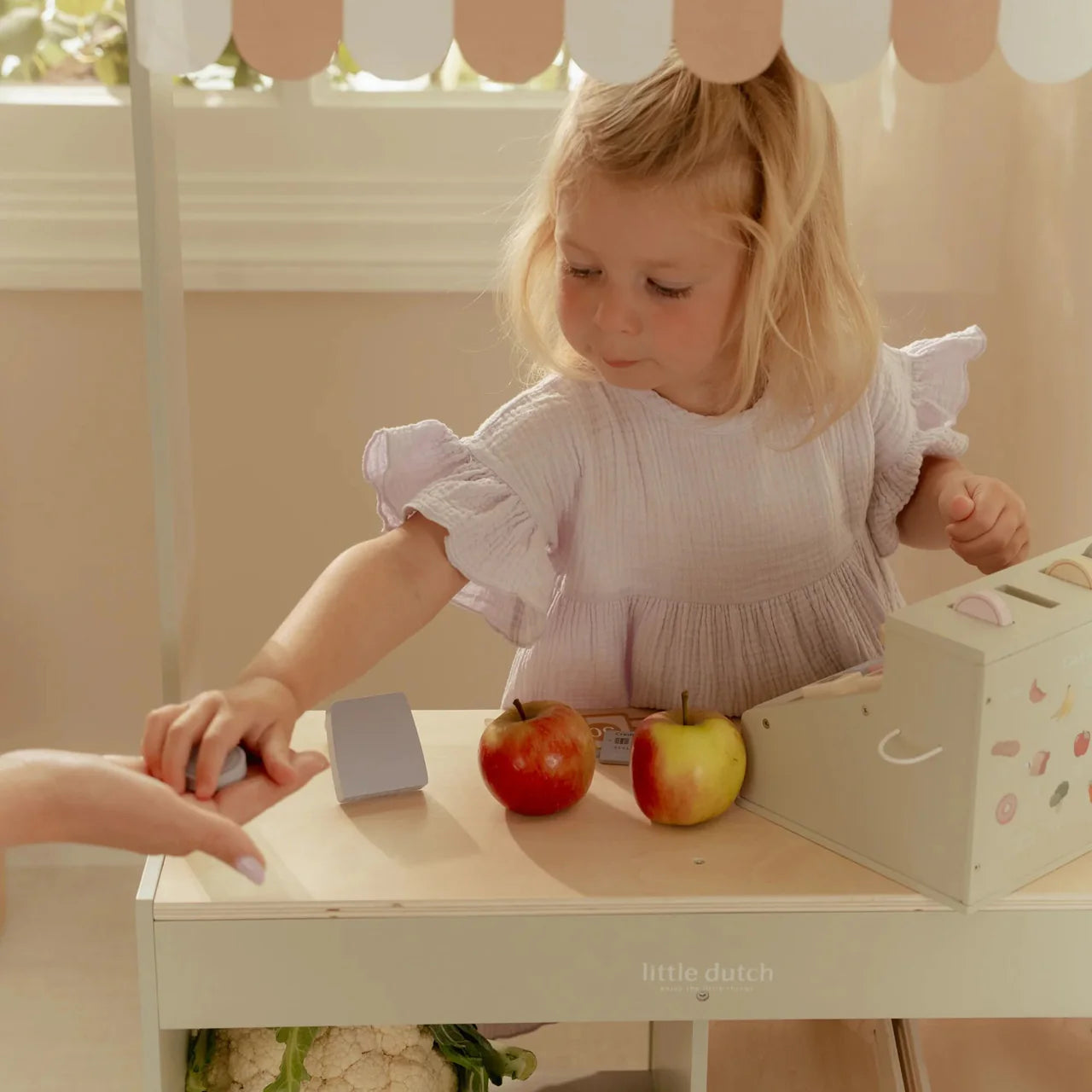 La caisse enregistreuse Little Dutch comprend un scanner, des boutons numériques, un tiroir-caisse, de l'argent jouet et une option de carte de paiement.