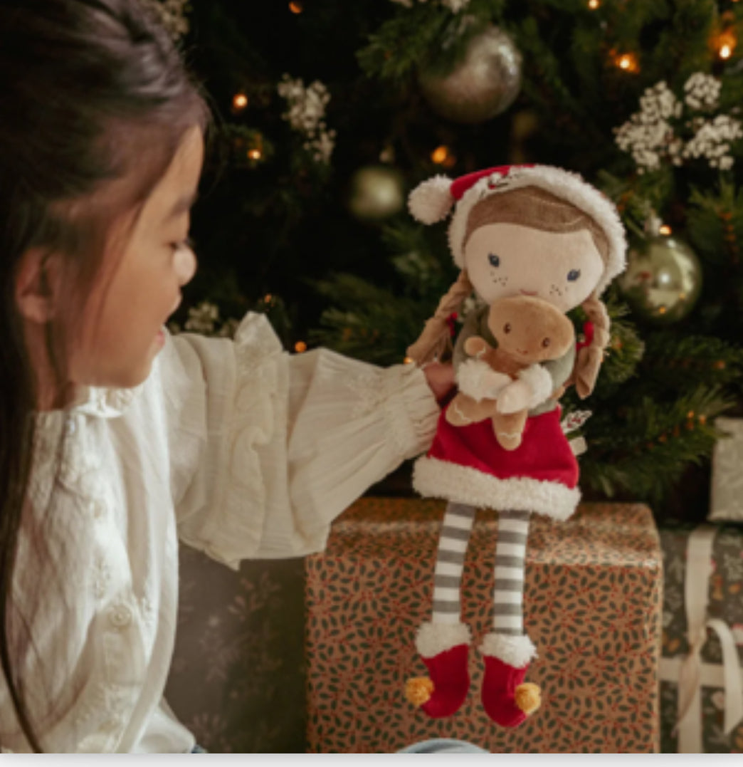 La tenera bambola Rosa è pronta per la festa di Natale! Con un cappello rosso in testa e un vestito abbinato, banchetta con il pan di zenzero appena sfornato. Rosa vuole celebrare questi giorni divertenti con te.