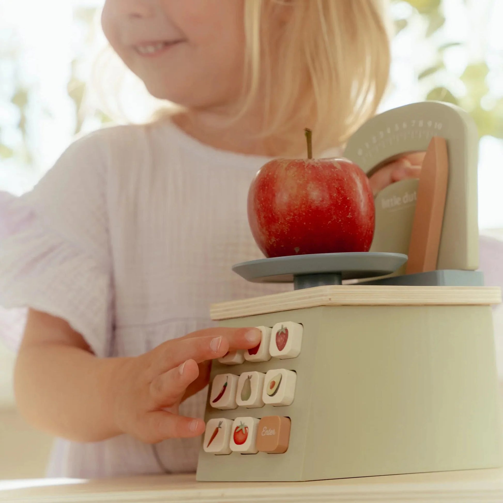 Un ingrediente perfetto per qualsiasi piccola cucina! Con questa bilancia da gioco in legno, piccoli fornai e chef possono pesare con precisione i loro ingredienti. Posiziona i prodotti sulla bilancia e guarda come l'ago indica il peso. La bilancia ha veri pulsanti con illustrazioni, rendendo il tempo di gioco in cucina ancora più realistico. Perfetto da combinare con la cucina da gioco e il set del mercato per un divertimento senza fine!