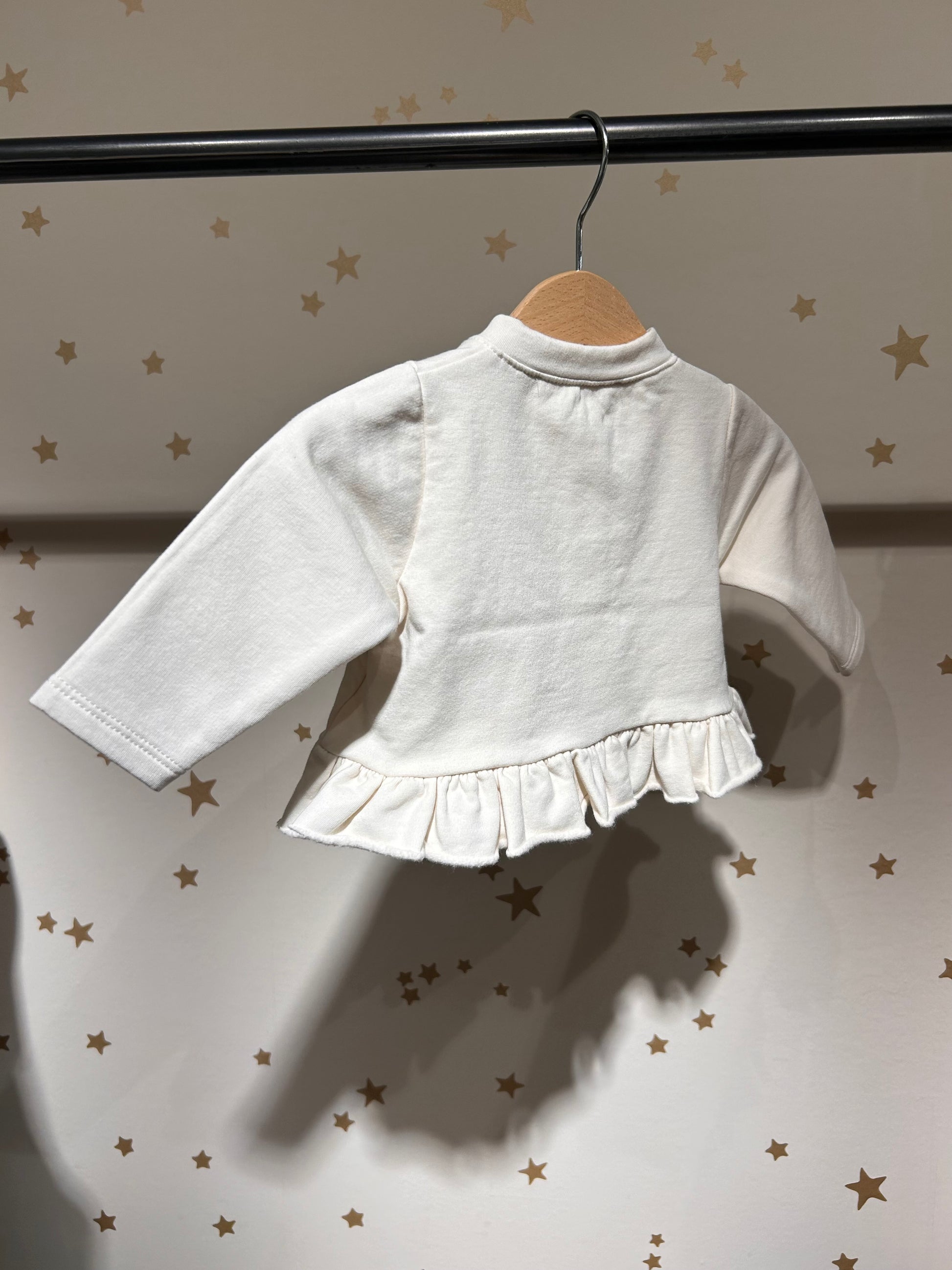 Il Cardigan felpa baby avorio, è l'ideale per tenere al caldo e comoda la tua bambina, grazie alla morbida felpa con interno felpato. La pratica abbottonatura frontale rende questo cardigan facile da indossare, mentre la balza finale aggiunge un tocco di stile. Completato dall'abbinamento con i leggings baby avorio con rouge e alla maglietta baby costina rosa, sarà perfetto per ogni occasione, anche quelle speciali!