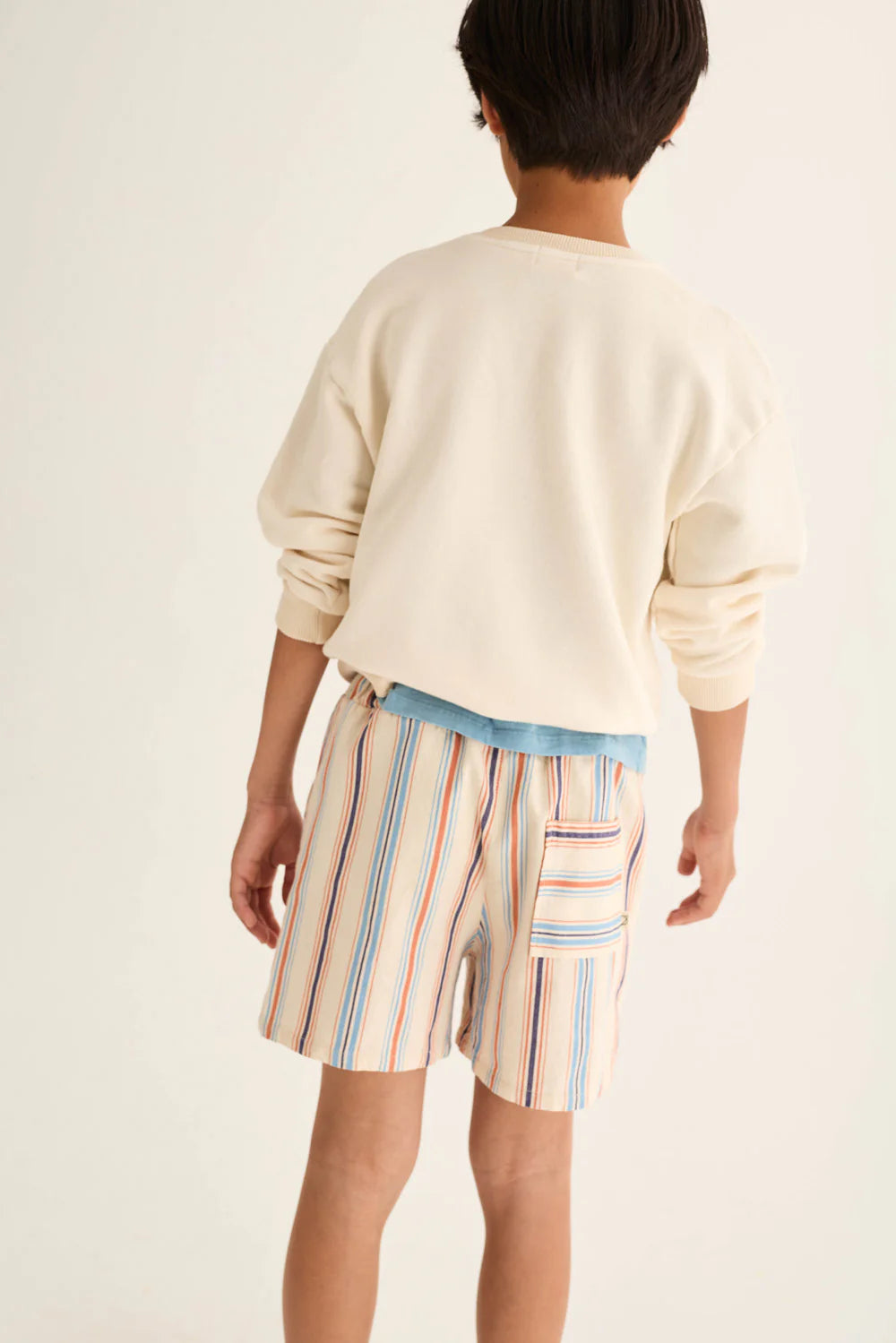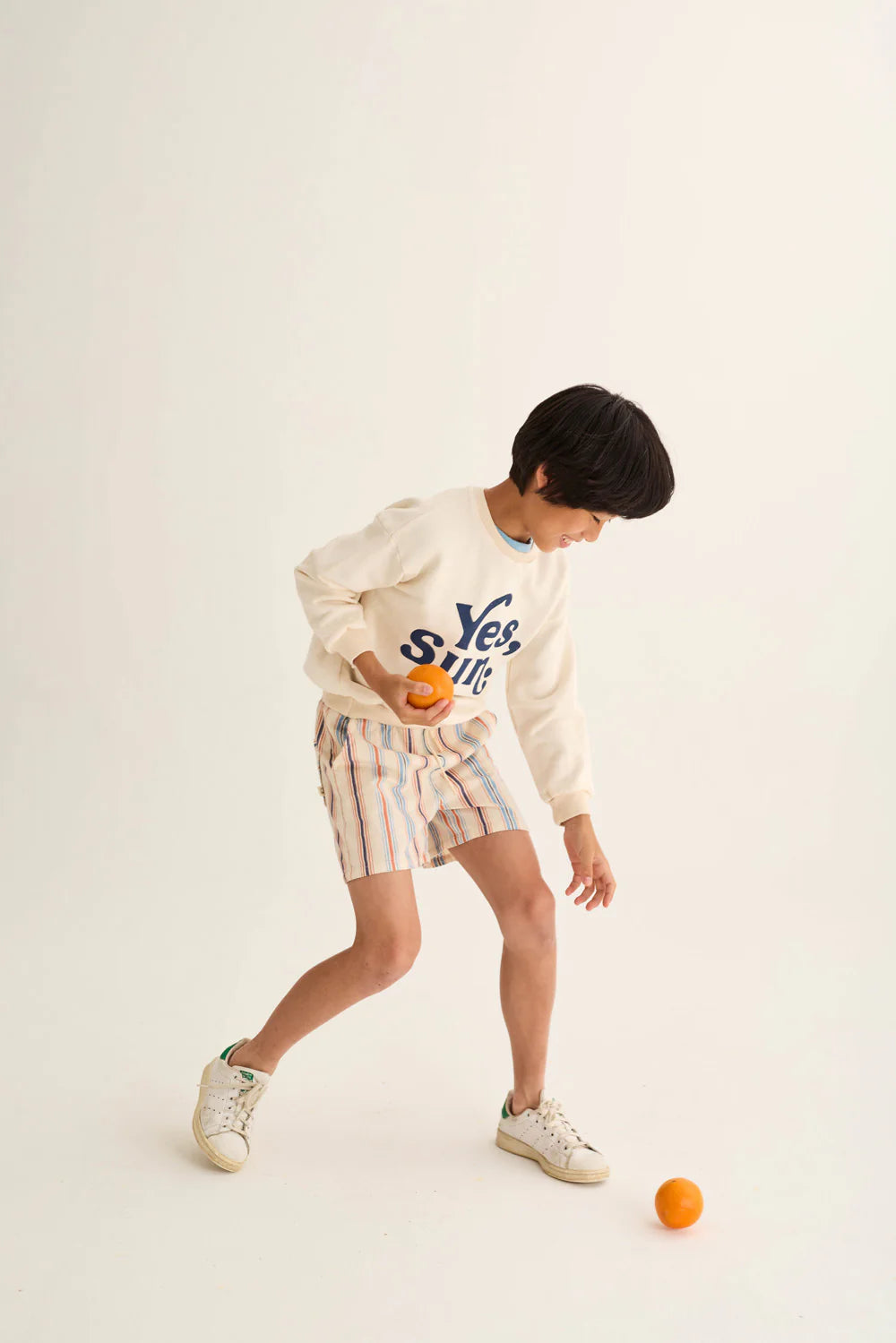 Felpa per bambini in morbido cotone. Presenta scollo rotondo, spalle scese e maniche lunghe con cuciture laterali in avanti. Rifinito con collo, polsini e orlo a coste, e decorato con un motivo stampato con la scritta "Yes, Sun".
