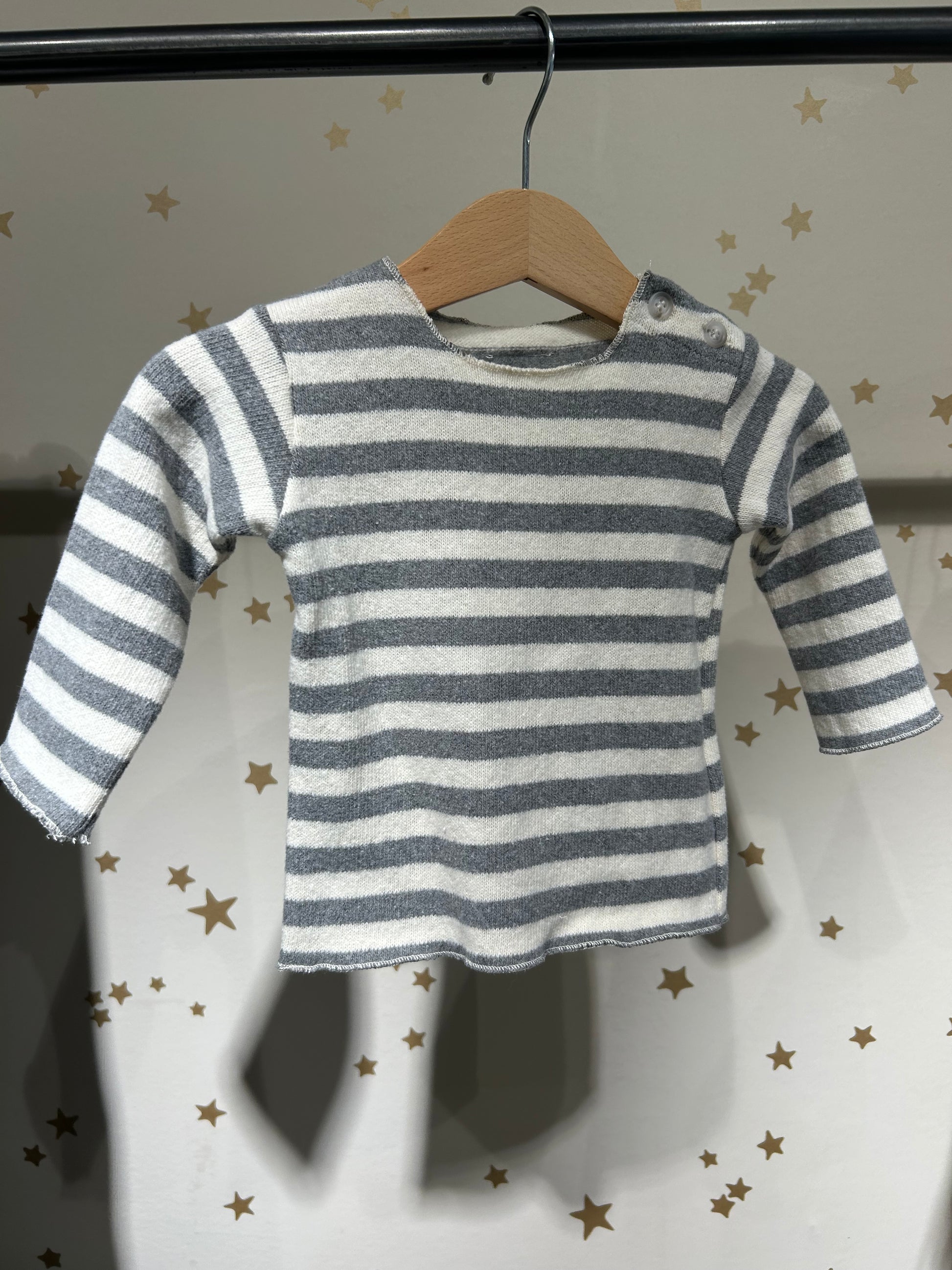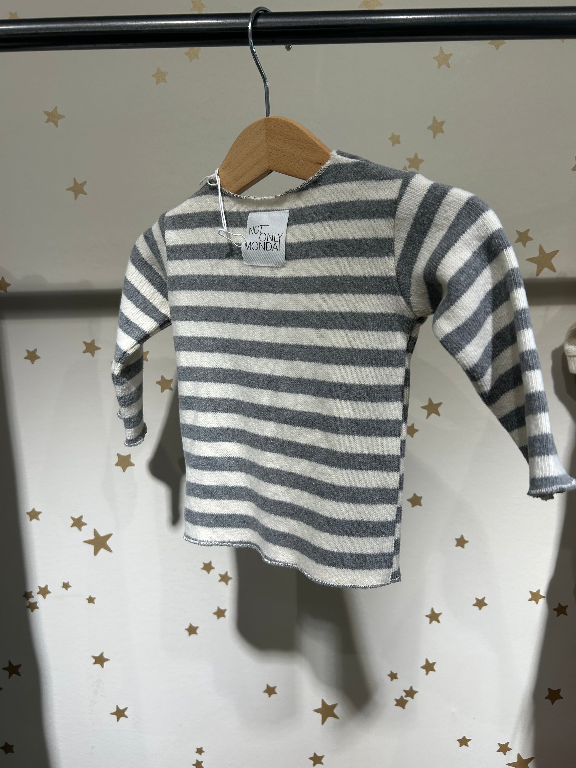 Questa maglietta da neonato è realizzata in caldo cotone a righe panna/grigio, perfetta per tenere al caldo il tuo piccolo senza rinunciare allo stile. Combina la maglietta con i pantaloni in maglia Snoopy con bretelle o con i pantaloni Ersilio grigio in caldo cotone per un look completo e coordinato.