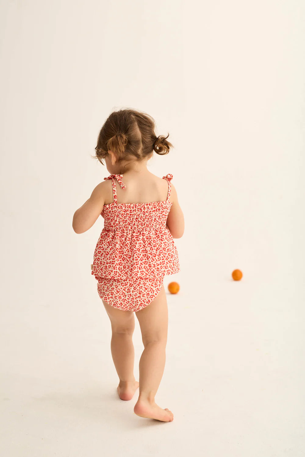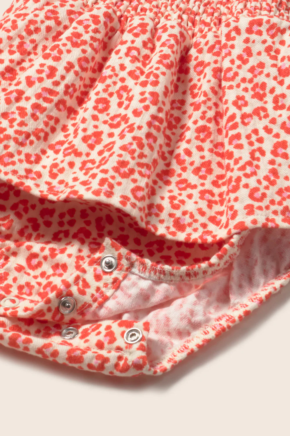 Pagliaccetto in cotone per bambini con stampa animalier all-over. È dotato di delicate spalline e smocking elastico sul petto per una vestibilità comoda. Il design include una cucitura in vita con una sopra gonna arruffata e un fondo in stile bloomer. Le chiusure a scatto sul fondo consentono una facile vestizione.