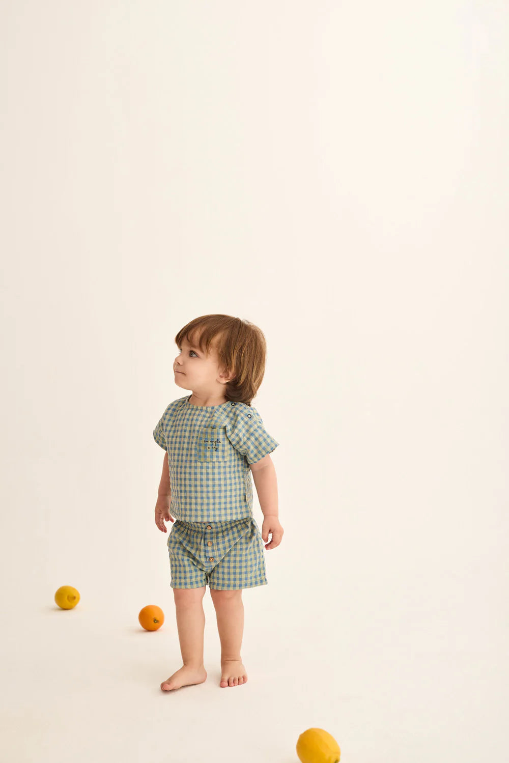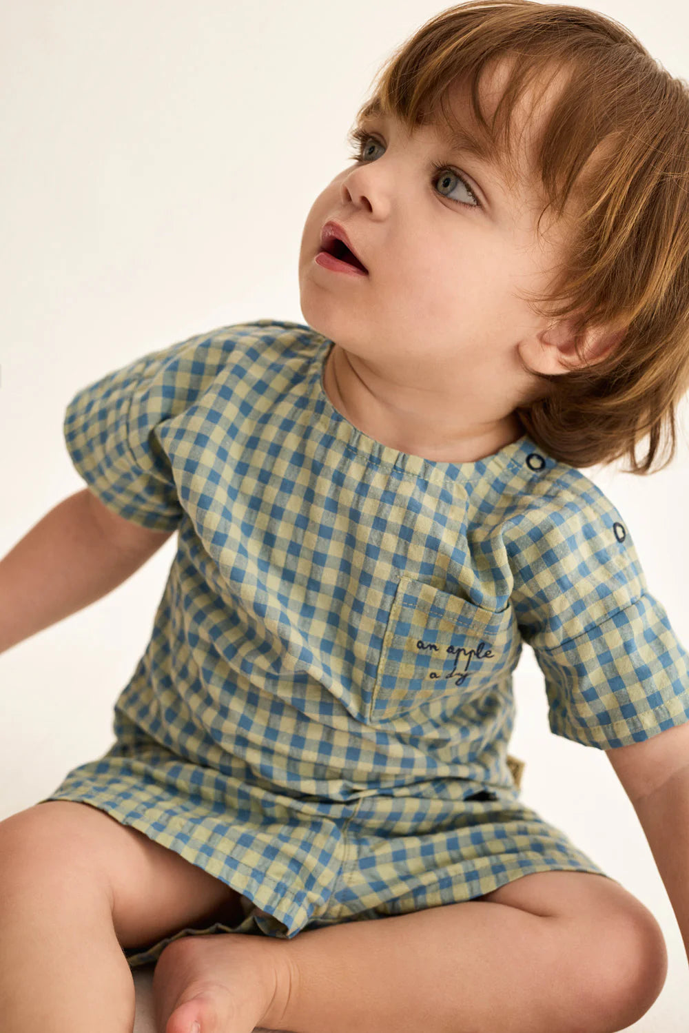 Pantaloncini in cotone per neonati in un fresco e vivace motivo a quadretti. Presentano una cintura elastica, bottoni decorativi e una tasca posteriore applicata ricamata con il messaggio "a apple a day".