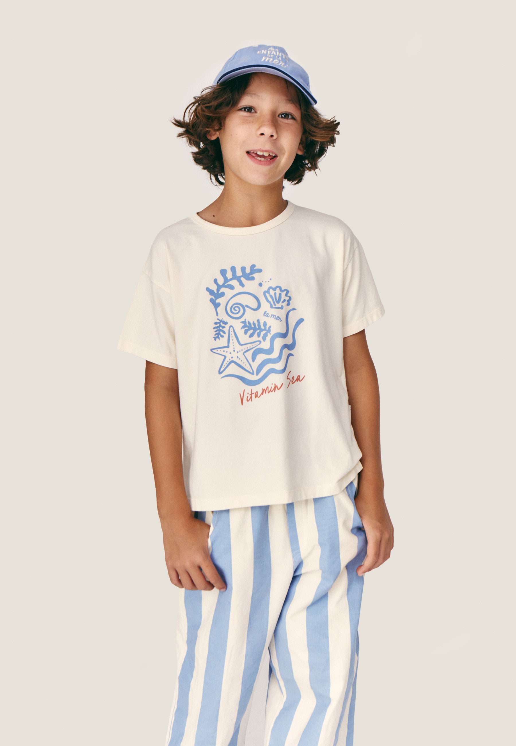 Eleva il guardaroba del tuo bambino con capi essenziali come questa maglietta. In cotone biologico, presenta un'illustrazione personalizzata tema marittimo di “Vitamin Sea” sul petto. Colori neutri e allegri che si adattano facilmente ad ogni outfit.