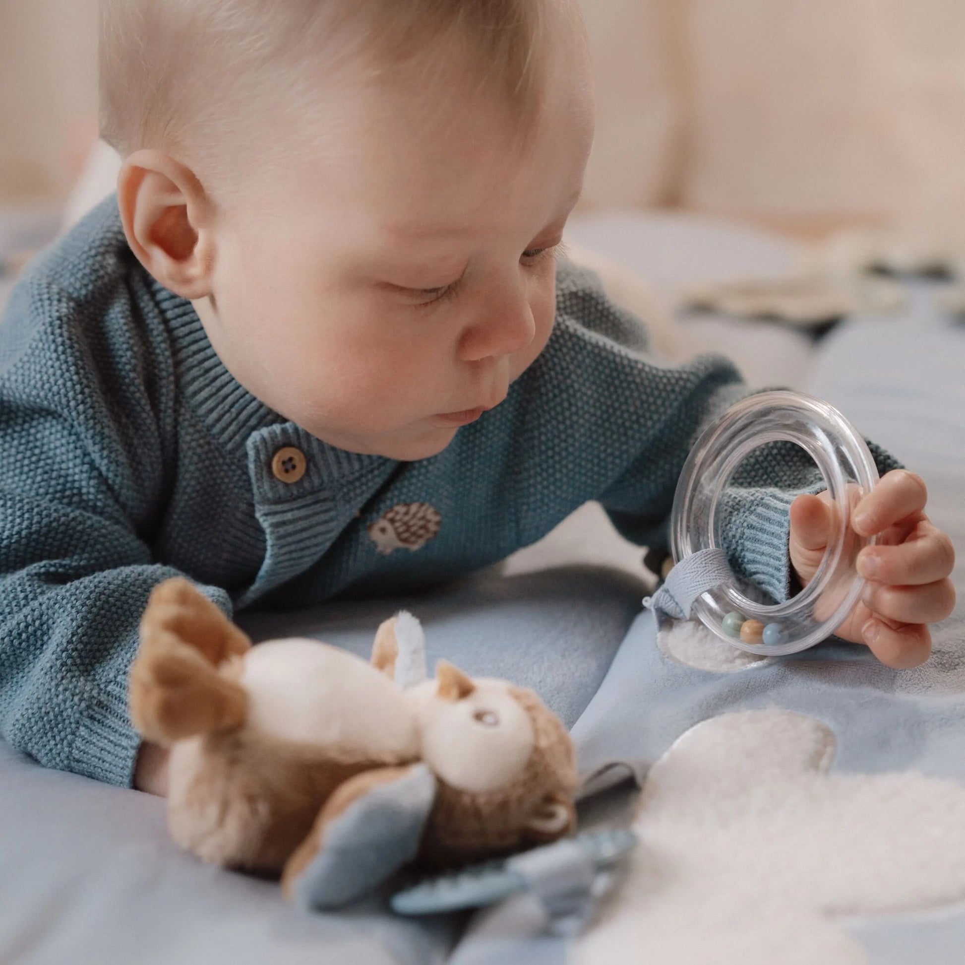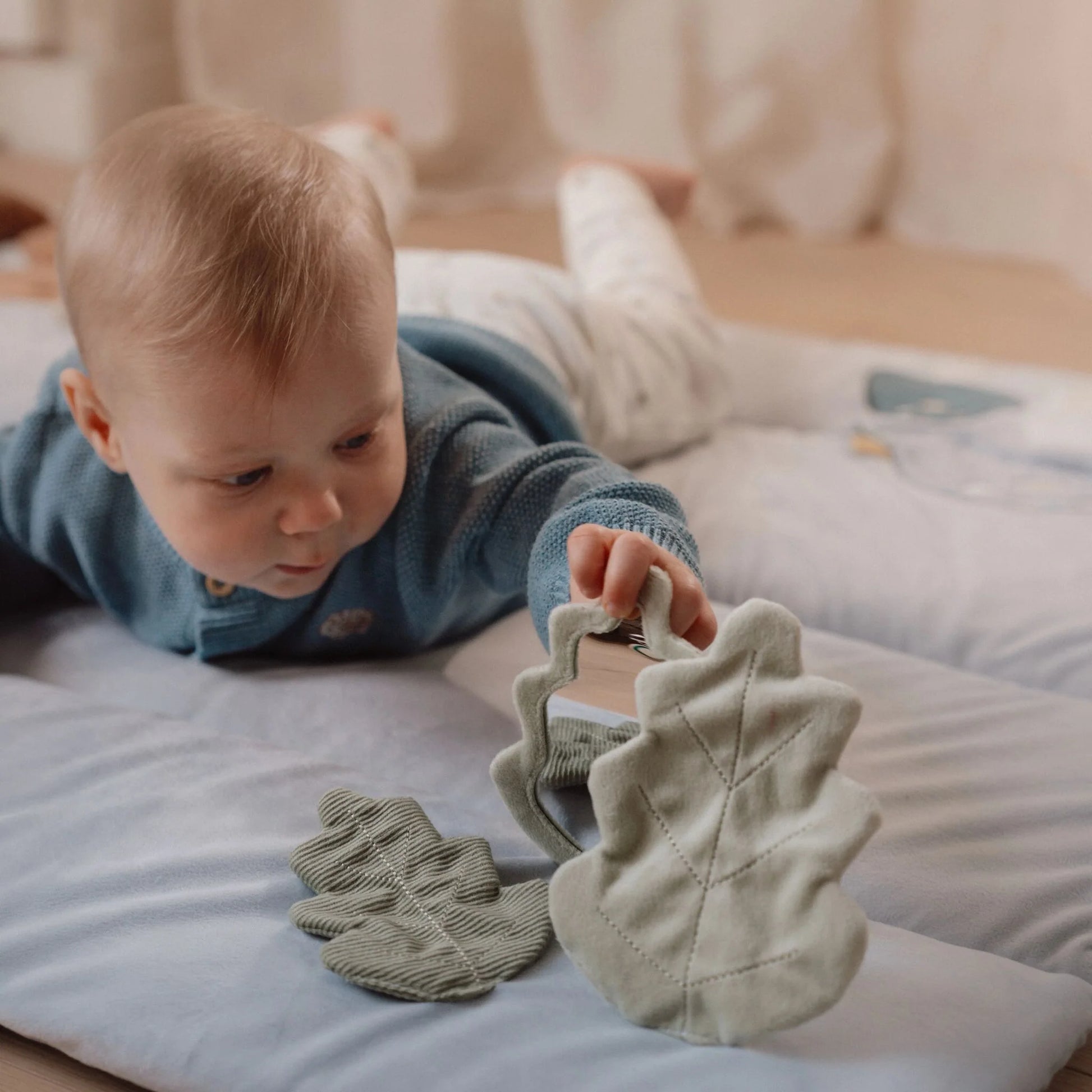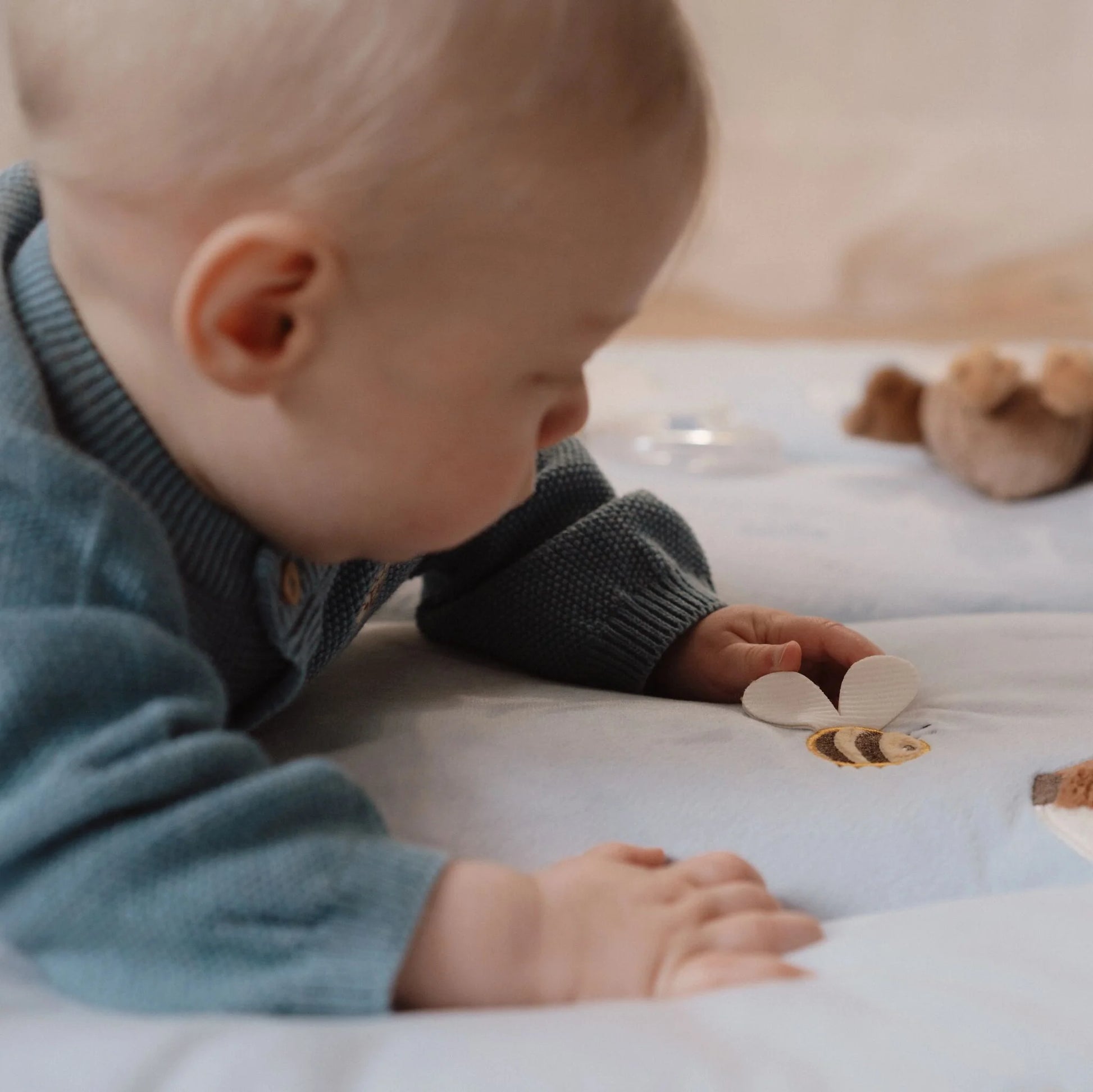 Immergiti nella magia degli Amici della Foresta su questo simpatico tappeto da gioco blu. C'è così tanto da scoprire e vedere! Vai in un'avventura per trovare la foglia rugosa e le nuvole morbide, incontrare la dolce volpe e giocare con il gufo e il piccolo scarabeo. C'è anche un piccolo specchio per la scoperta di sé e un anello trasparente con tre perline che sferragliano quando si muovono. Questo tappeto da gioco imbottito con varie trame e attività stimola i sensi e lo sviluppo del tuo bambino.