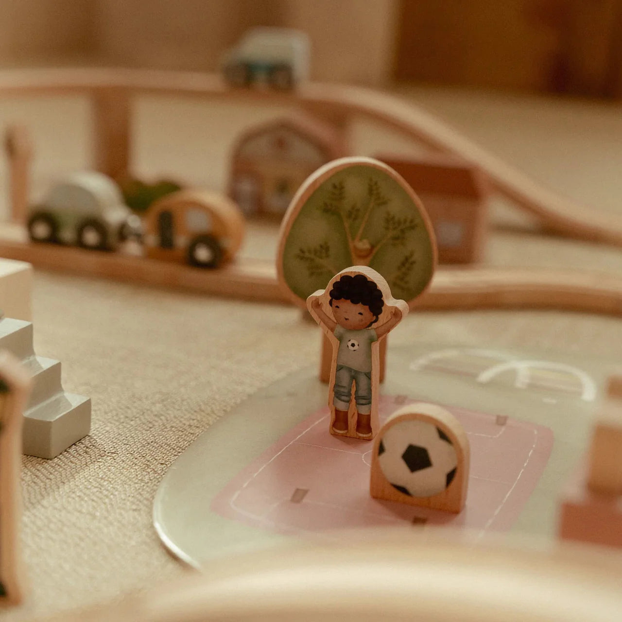 Costruisci il tuo mondo con il set di treni in legno XL! Questo ampio set include una locomotiva, carri, binari, ponti, edifici, auto e figure. Ci sono anche alberi e segnali stradali. Le possibilità sono infinite! Guida il treno sul ponte, fermati alla stazione ed esplora la città. Combina il set di treni XL con i set di espansione per rendere il gioco ancora più divertente. Stai salendo a bordo?